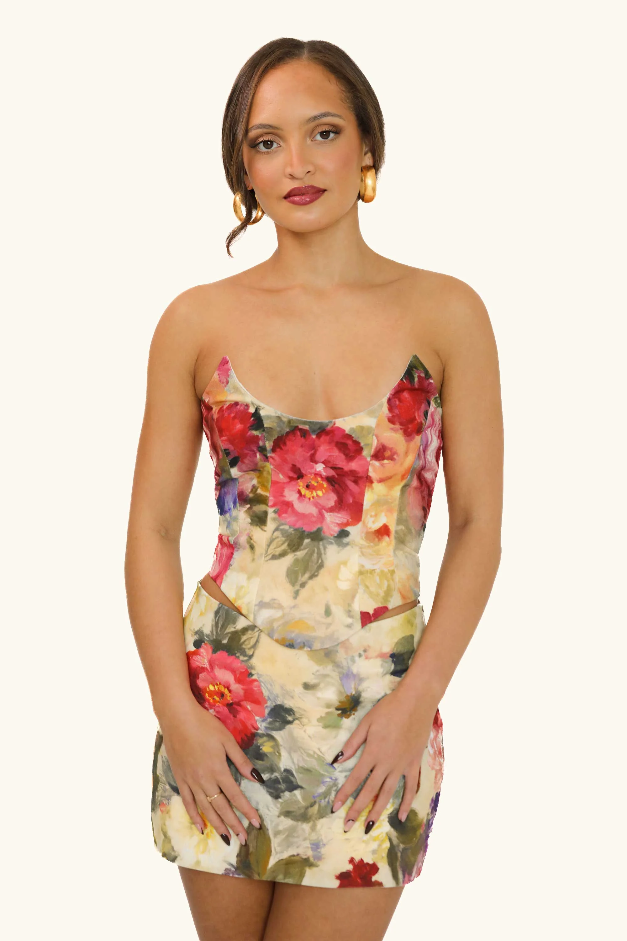 A corset-style floral printĀ bandeau with a lace up back andĀ scooped neckline paired with our matching Dawn Mini Skirt. Created ethically and sustainably in London by a small team of women.Ā ThisĀ top is cut for aĀ figure-huggingĀ fit fromĀ thickĀ 100% cotton.Ā The Dawn skirt isĀ is made from a gorgeous cotton in soft, summery shades. Cut from 100% cotton, this mid-rise skirt gently skims the hips with a fitted, a-line shape.
