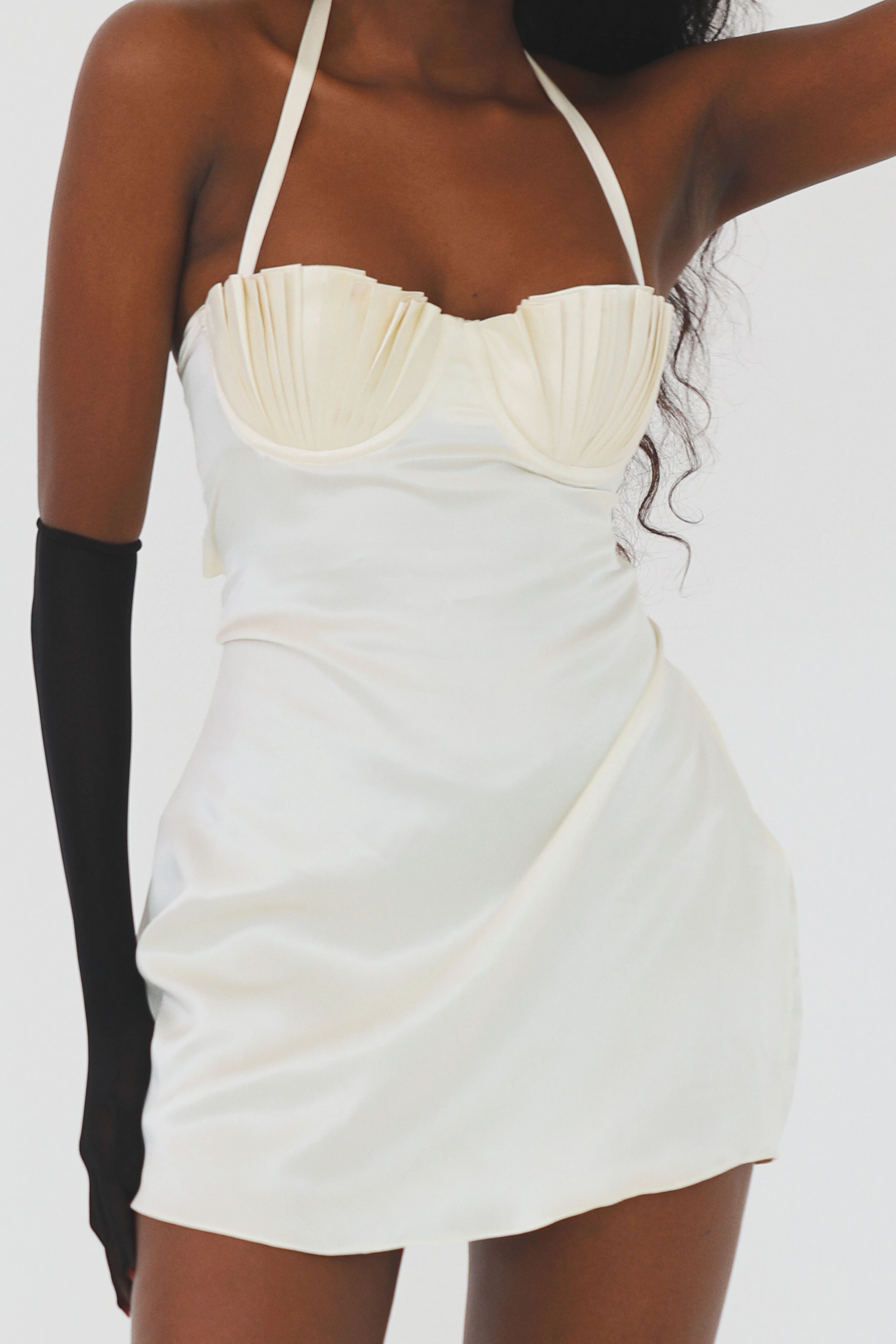 Our radiant 'Soleil' dress is named for its gorgeous rippling texture. It's cut from lustrous 100% silk crepe-backed satin and has underwired, lightly padded 'shell' cups for a little lift. Our fluid ivory silk softly skims the female figure and falls to a perfect mini length. Ground yours with chunky knee-high boots, or delicate barely-there sandals. Get your hotly anticipated slinky dress, which will be released in very limited runs.